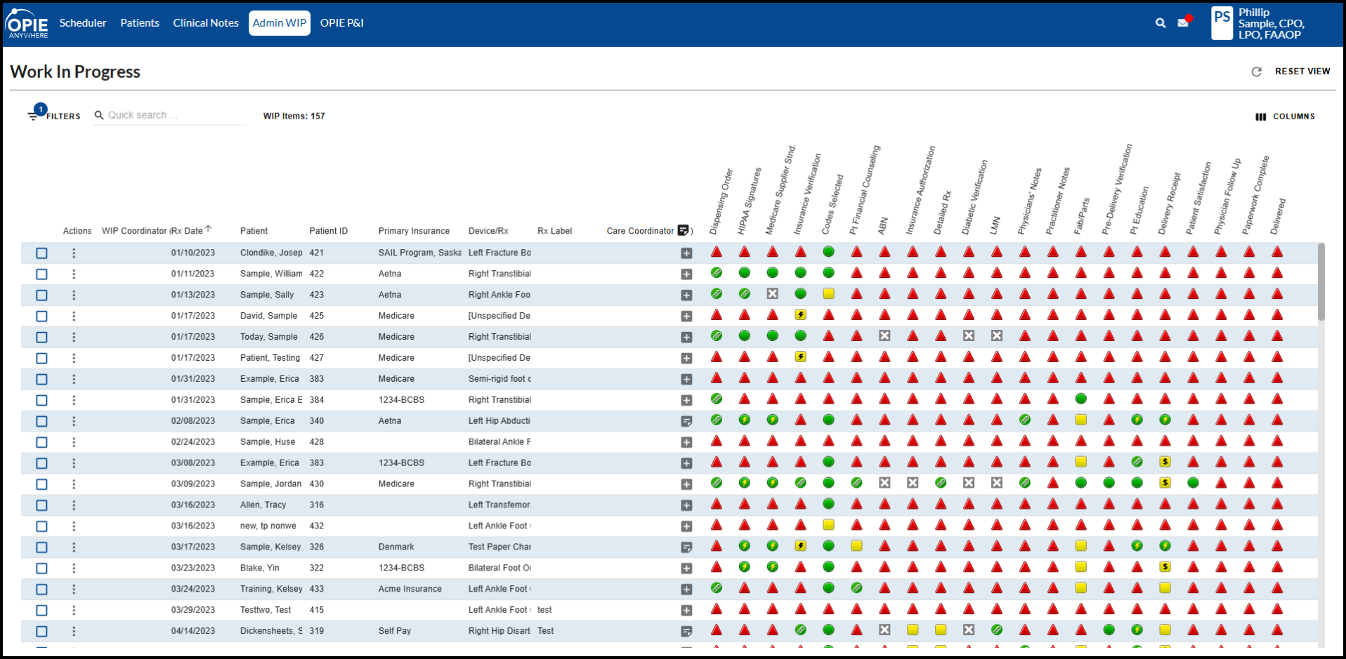 The Admin (WIP) dashboard in OPIE Anywhere delivers significant improvements to help O&P practices manage patient care more effectively. This enhanced WIP provides real-time visibility into patient progress and workflow status, enabling better operational control and improved patient outcomes. It includes intuitive filters for sorting and organizing patient cases, user-configurable columns and views, and clear visualization of task progression and deadlines.